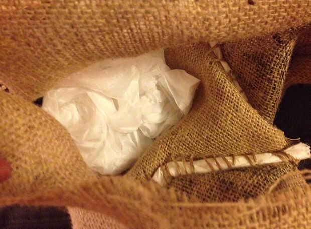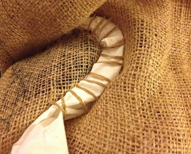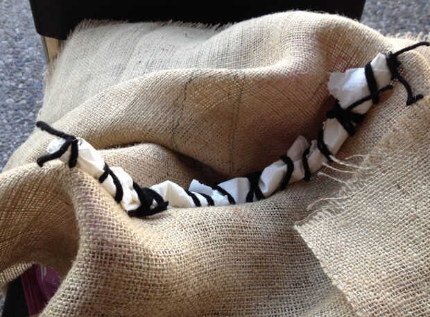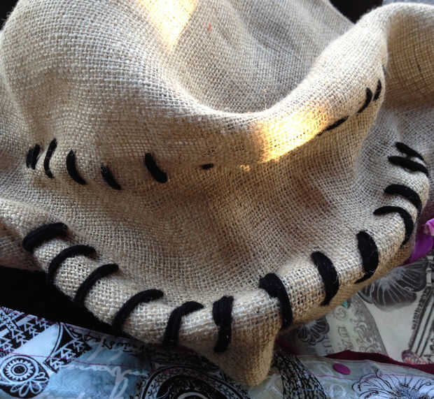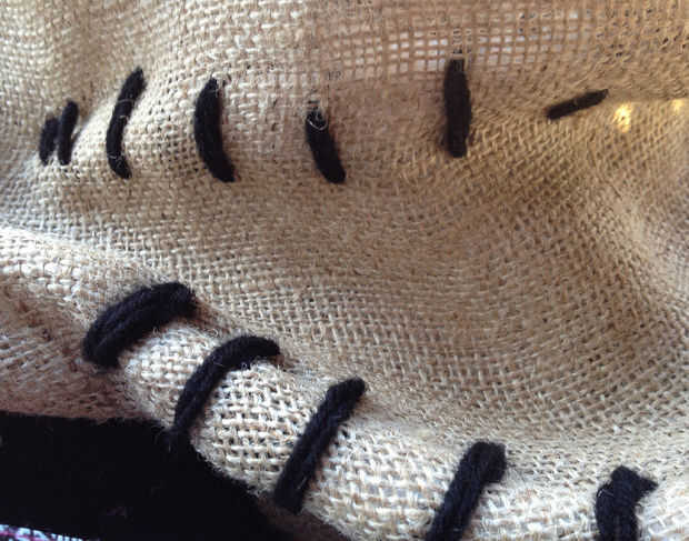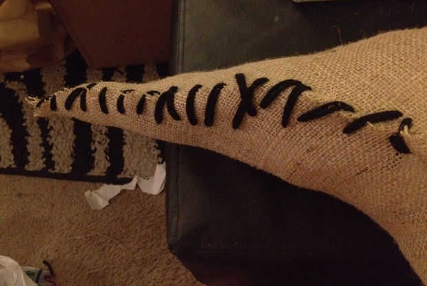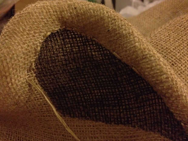 Intenté hacer el tejido de ojos que se podía ver, pero la tela estaba reuniendo demasiado y fue un lío importante, así que sólo en forma de los ojos con el rotulador uniformemente coloreado en donde estarían los ojos. (Podía ver a través de la arpillera, por lo que fue una gran solución para los ojos de la tela).