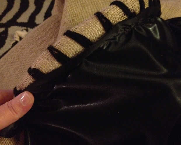 Tomé algunas toallas de papel y rellenado algunas formas de alambrepara la boca (superior e inferior) por lo que puede tener la apariencia hinchada, igual que Oogie Boogie en la película. Hice un preliminar coser-en con el hilo negro y notó que no estaba obteniendo la forma completa de los puntos de sutura de labio, así que hizo un segundo recorrido y exagerada los puntos existentes para completar el efecto. Lo hice con los labios superior e inferior. Entonces usé algunos hilo negro para coser en el derecho de la tela negra a lo largo de la línea del labio interno. Salí de allí algo exceso de tela y acaba de hacer cortes de borde limpio después de que yo había cosido en el rectángulo gigante. jajaja (amateur)