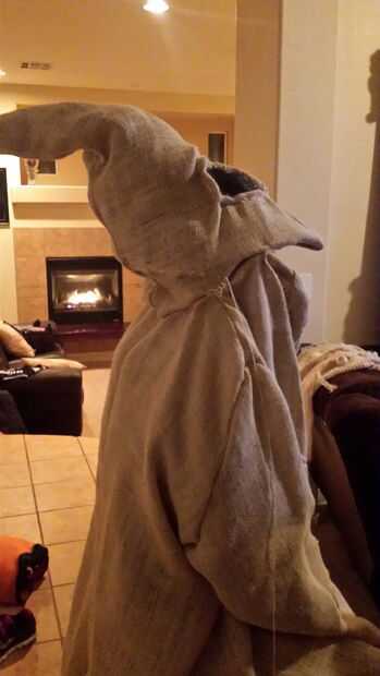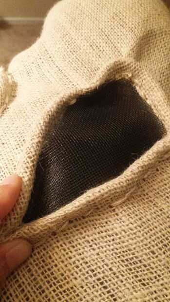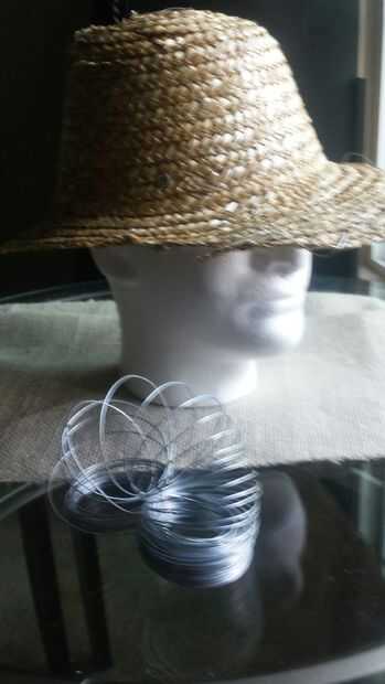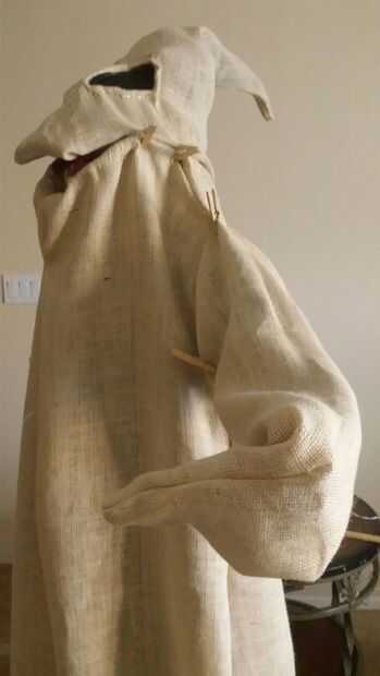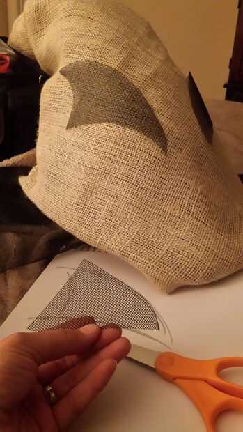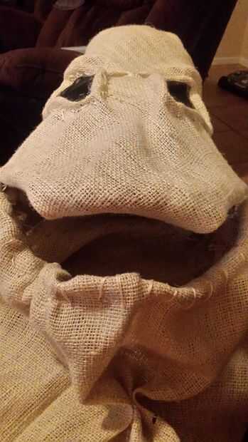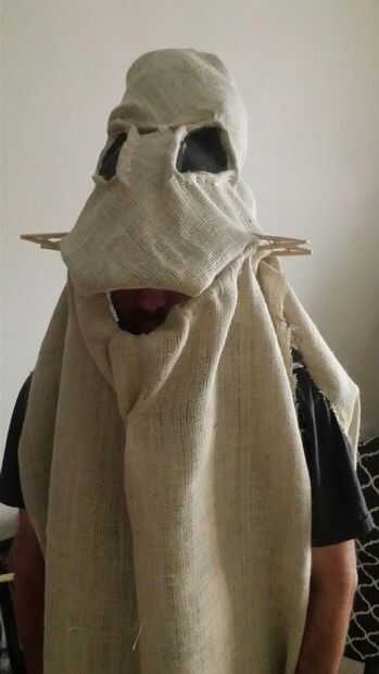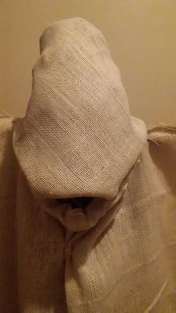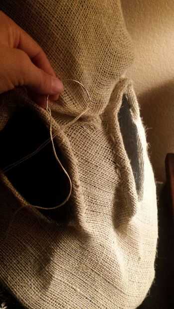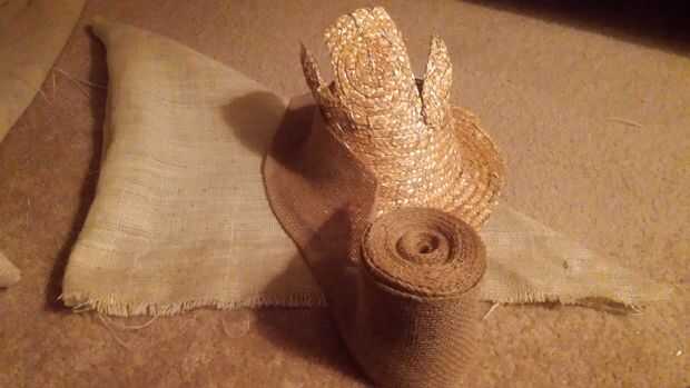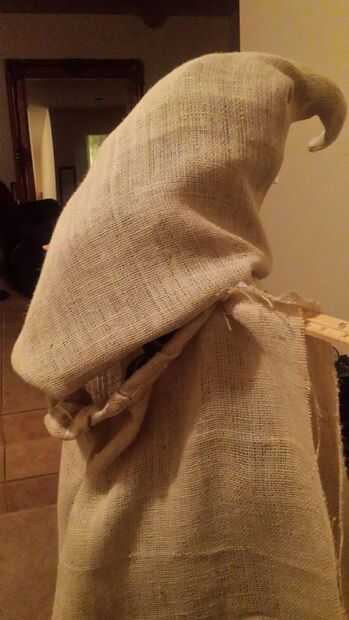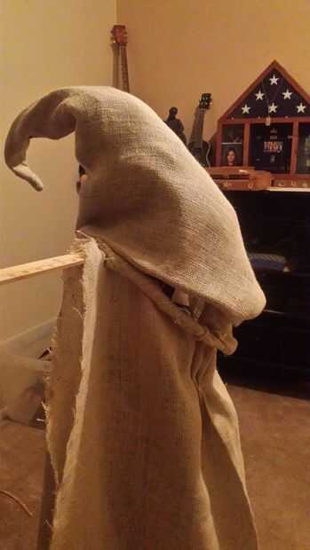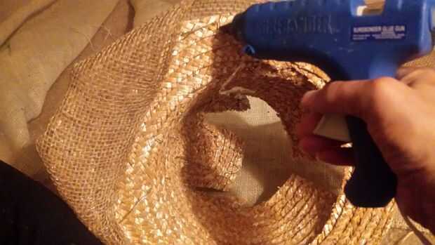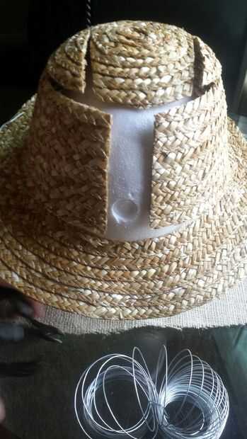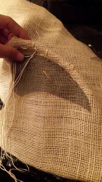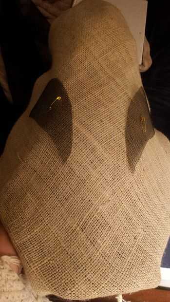 La pieza principal comenzó como un sombrero de paja. Después de cortar para cambiar su forma, he añadido la arpillera, que se formó como un cono grande. Alambre de la joyería era torcido alrededor trozos de arpillera y colocado dentro de la parte puntiaguda de la cabeza. Más restos fueron agregados para añadir volumen, continuando añadir forma a la pieza principal.