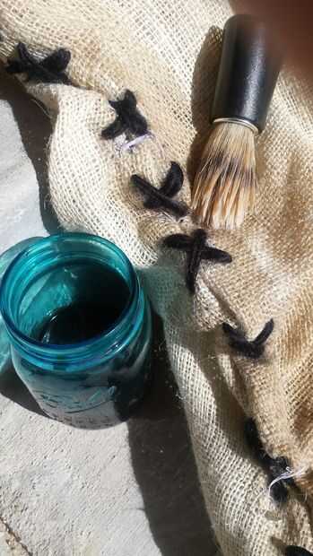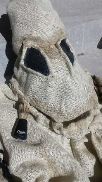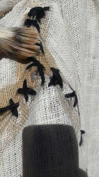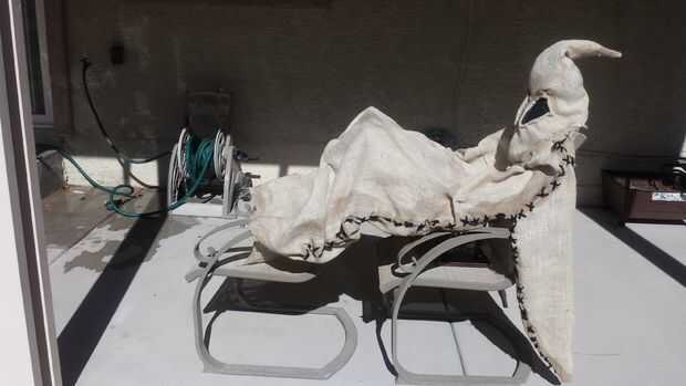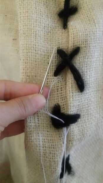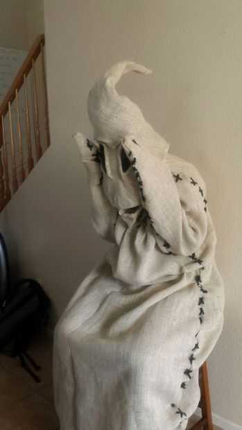 El hilado fue utilizado para agregar detalles y fue cosido elástico en donde quería algún rebote y dar. Café de ayer fue pintado para agregar "moobs" y añadir a la ilusión de la zona del bajo vientre (la mente mi esposo es delgado). Las axilas y la boca se resistieron con el café, así, entonces el traje entero se puso fuera a seco en dos sillas.
