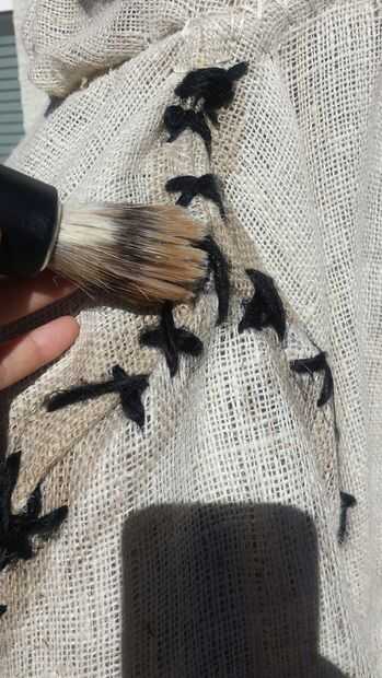 Para los pies, mi modelo llevaba botas de combate color neutro que envuelto con arpillera y caliente pegado en su lugar (no para el arranque, de la misma arpillera de la arpillera). Este fue el último minuto.