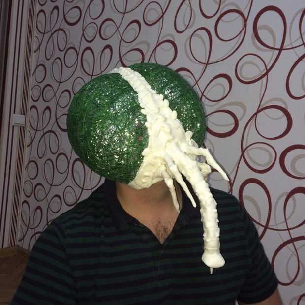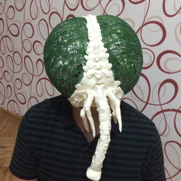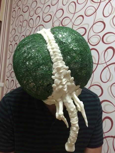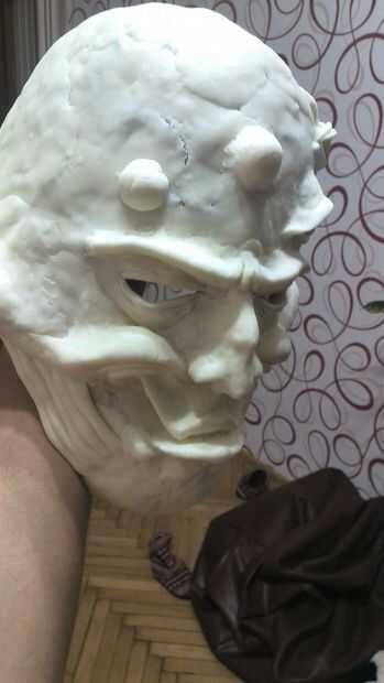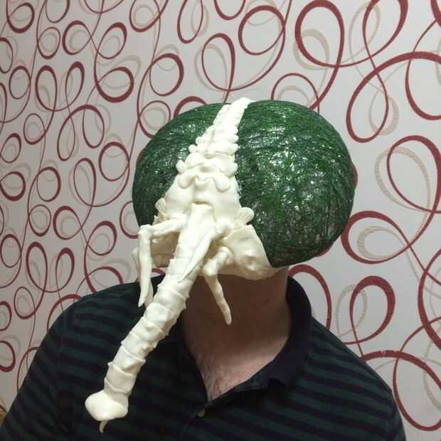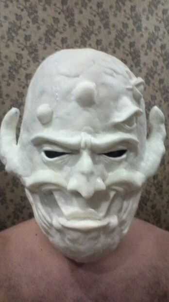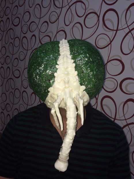 Decidió hacer una máscara de una mosca luego... no sé por qué pero salió bastante bien. La misma técnica. Carcasa de aluminio. Los ojos están hechos con un hilo mojado en pegamento y aliento en un globo. La malla curada se corta en mitades.