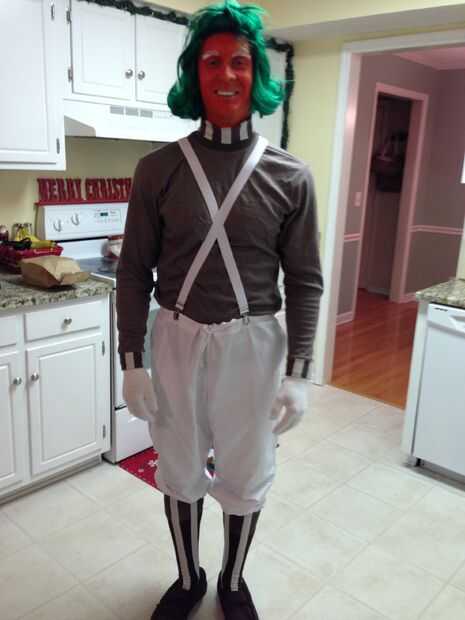 Peluca verde, marrón-cuello de tortuga (usado blanco y teñido con tinte Rit marrón), marrón de fregado blanco pantalones blancos guantes marrones medias (usado blanco y teñido con tinte Rit marrón), zapatillas de casa, pintura de cara naranja, pintura de cara blanca para cinta athletic de tirantes, blanca cejas, blanca.