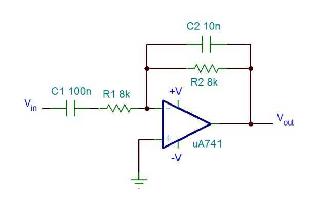 Filtros band-pass son una combinación de un filtros paso bajo y paso alto (imagen 1). El truco es que mientras que la combinación de R1-C1 entrada forma la porción paso alto y el combo de retroalimentación R2 C2 la porción de paso bajo, el cociente de dos resistencias R2/R1 todavía determina la ganancia del amplificador, por lo que la matemática puede divertirte un poco. En primer lugar determinar su región de paso de banda, es decir, las frecuencias más y mínima que quieras pasar. Estas son las frecuencias de dos esquina que queremos usar en nuestros cálculos. Vamos a usar 200Hz y 2kHz. Utilizando la misma ecuación como antes y elegir ya sea R o C, podemos determinar la otra. Puede ser más fácil elegir R2 y R1 según la ganancia que desea alcanzar y luego calcular C1 y C2 en base. Es perfectamente aceptable para elegir lo que frecuencias de corte y ganancia que desee, dentro de las limitaciones de lo op-amp. Vamos a aumentar R1 y R2 por un factor de 10 a 8kΩ. Esto hace que 10nF C1 (103) y C2 100nF (104).
