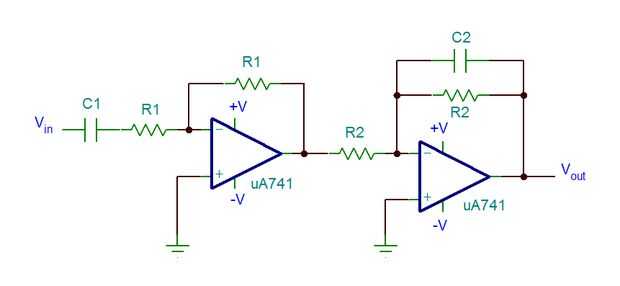 Imagen 8 muestra un esquema genérico que logren los mismos resultados pero utiliza dos filtros en cascada juntos. La primera parte es el filtro de paso alto, seguido por el filtro de paso bajo. Colocando primero el filtro de HP, el filtro LP atenuará las anomalías de alta frecuencia que pueden venir a través de si les cambia. Además, cada parte puede tener su propia ganancia, que puede facilitar la construcción de piezas en mano.