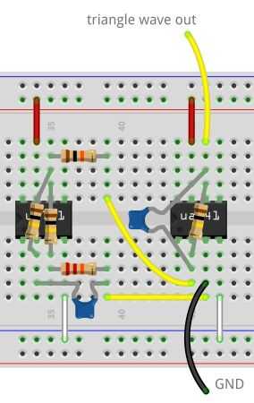 Construcción: Conectar un segundo amplificador operacional al poder como conectamos el segundo ejemplo de onda cuadrada. Colocar un resistor de 10kΩ entre la salida de la onda cuadrada y el pin 2. Conecte un resistor de 100kΩ y el condensador de 100nF (104) entre los pines 2 y 6. Lazo 3 pin a GND (imagen 2).