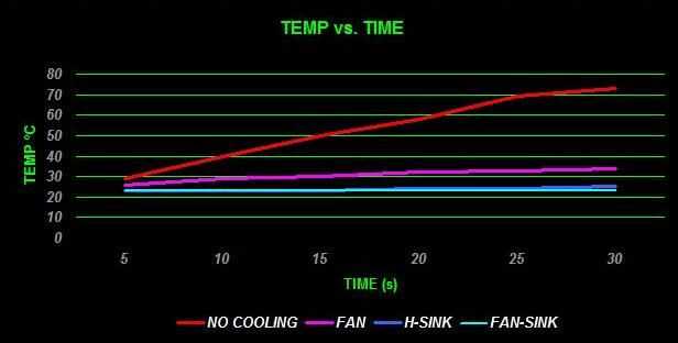 Ya que utiliza un transistor de potencia para ejecutar una carga pesada es una muy buena idea tener un sistema de refrigeración. Como el gráfico muestra sólo un disipador de calor ayuda a mucho fan no es una necesidad.