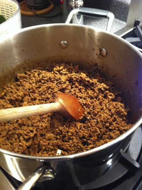 Cocinar la carne picada hasta que rosa es ido, escurrir la grasa y añadir 1 paquete de condimento para tacos y 1 taza de agua. Deje para cocinar abajo por lo que se absorbe el agua y los condimentos.