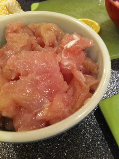 Capa de pollo en dados en el condimento y saltear a fuego medio hasta que esté cocido (hasta que los jugos salgan limpios o una temperatura interna de 170 grados). Reservamos para rellenar los tacos.