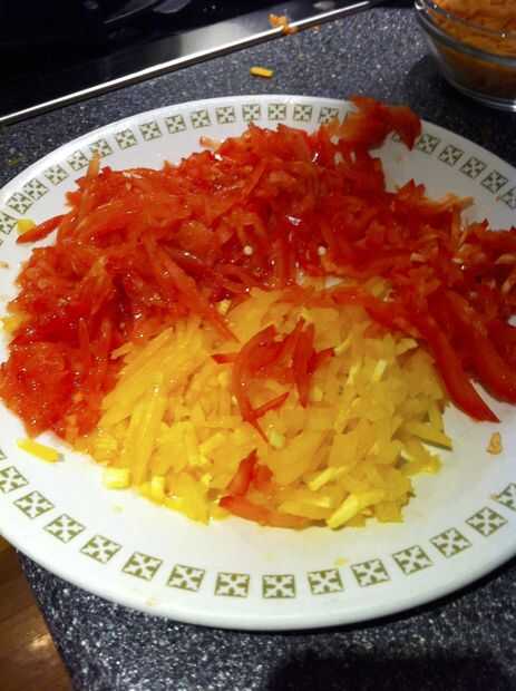 Lave todas las verduras en agua fría y cortar en cuadritos pequeños. Utilizamos una mandolina * para picar fácil. Colocar cada verdura en cuadritos en un recipiente separado para un fácil acceso.