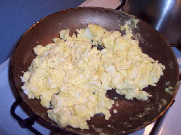 5. Mantenerlo en movimiento con la espátula hasta que quede bonito y esponjoso. Mantener rascado los huevos desde el lado de la cacerola