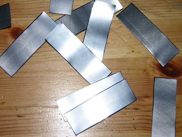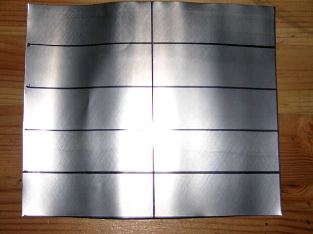 Las instrucciones que he leído para que este dicen utilizar una tira 1 "x 3", sin embargo me pareció más fácil de usar una poco más cuadrada obras pieza mejor, así que usan algo sobre 1 1/4 "x 2 1/2". Marcar los rectángulos en la hoja de metal usando un rotulador y luego recorto.