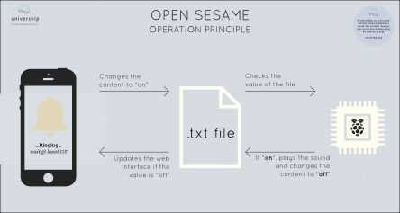 Cuando el usuario accede a la página web, una llamada ajax realiza que cambia el contenido de un archivo .txt en "on". El Raspberry Pi revisa este archivo cada segundo. Si detecta un cambio, se reproduce el sonido y cambia el contenido del archivo .txt a "off". La interfaz web se actualiza entonces para decirle al usuario que ha sonado la campana.