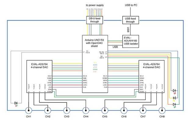 Seekat se basa en tablas de evaluación para el chip AD5764 de Analog Devices. Comunicación con las placas sobre el SPI se realiza con un Arduino, controlado por una aislado conexión USB a un PC. Para simplificar el cableado de comunicación y distribución de energía, utilizamos un escudo personalizado de Arduino. Arriba se muestra un esquema eléctrico completo.