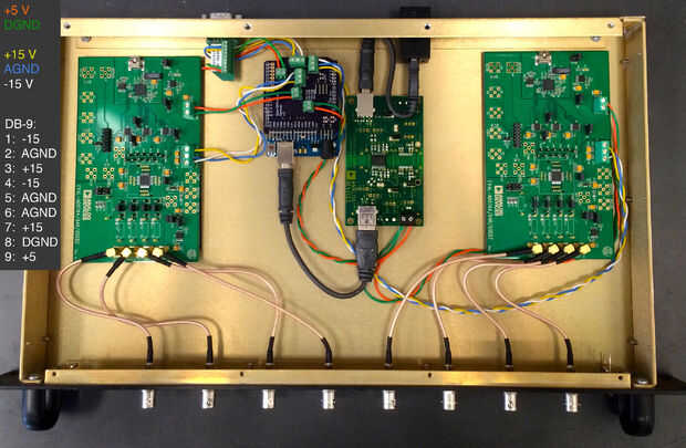 Hacer las conexiones de alimentación como se muestra a continuación. Pares trenzados para alimentación probable no tengan ningún beneficio, pero mantienen las cosas ordenadas. Usted tendrá un tiempo más fácil con los terminales de tornillo Si utilizas cable de conexión conductor sólido. Los cables SMB a los tableros AD5764 son conectados por debajo, pero otros cableado puede ser más fácil si usted salvar hasta el final.
