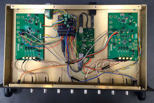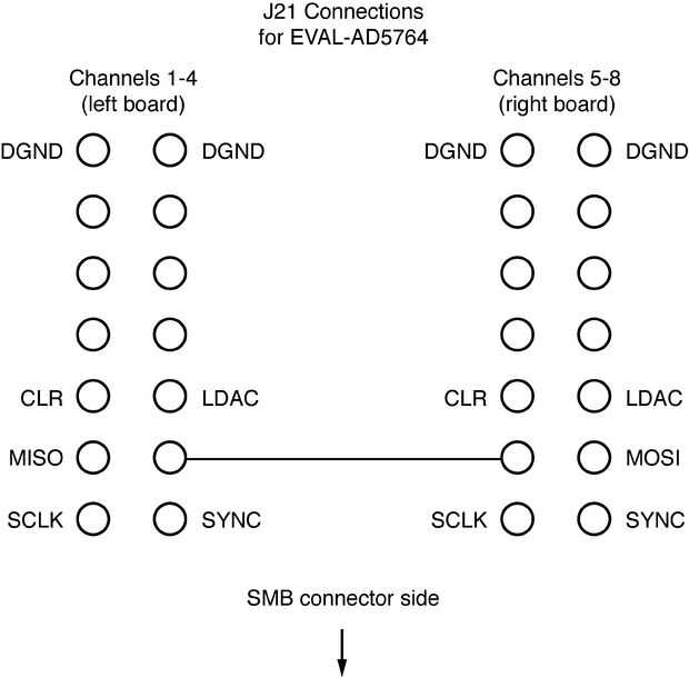 Hacer todas las conexiones para la comunicación mediante cables de jumper entre el escudo Seekat Arduino y los pernos J21 en los consejos de EVAL-AD5764. Véase un esquema de cableado de comunicación y una imagen de la Seekat completa. Etiquetas (LDAC, MISO, etc.) se refieren a ésos impreso en el escudo de Seekat Arduino que difieren en algunos casos desde las etiquetas de las tablas de AD5764.