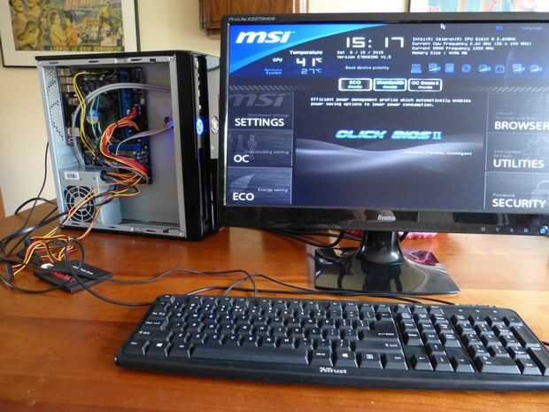 - Presione el botón de encendido. El sistema realiza una prueba y si todo funciona bien se mostrará el menú de arranque (ver imagen). Si algo está mal en el sistema ya no arranca o mostrará un error de arranque probablemente acompañado con varios pitidos. Si el sistema se niega a arrancar que probablemente no has conectado el poder suministrar adecuadamente (o se olvidó de encender el interruptor de la fuente de alimentación). Si aparece un error de arranque me refiero al manual de la placa base para acciones futuras. Posible el problema está relacionado con la CPU o la memoria. Cualquier manera, apague el sistema y asegúrese de que estos componentes estén insertados correctamente.