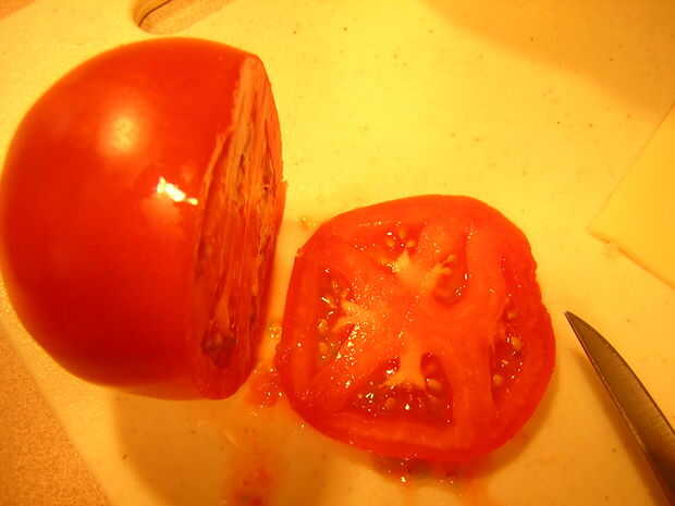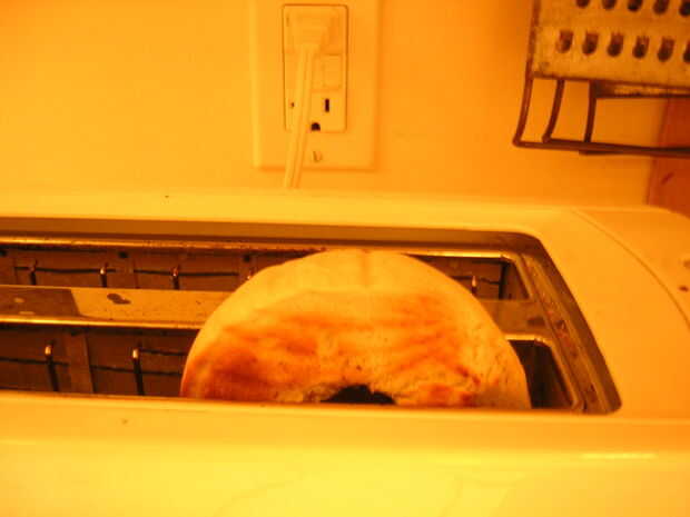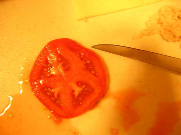 Primero desea tostar tu bagel. Mientras su tostado, puede cortar una rodaja delgada agradable de tomate apagado (aproximadamente 1/4 una pulgada). Reservamos la rodaja por ahora.