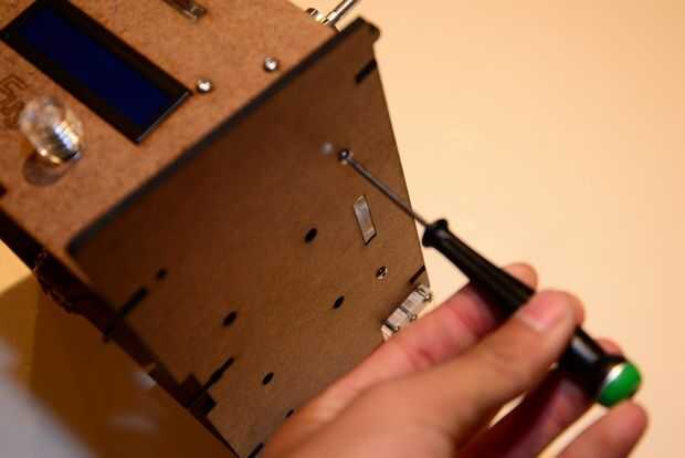 Attach the side plates. Antes de apretar completamente los tornillos, deslice el interruptor de la matanza y la batería embalan los cables a través de sus ranuras.