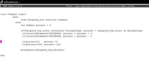 Después de este demo.rule goto archivo allí crear una regla para operar la velocidad según el aumento y disminución de dimmer, un enlace de la variable para el atenuador.