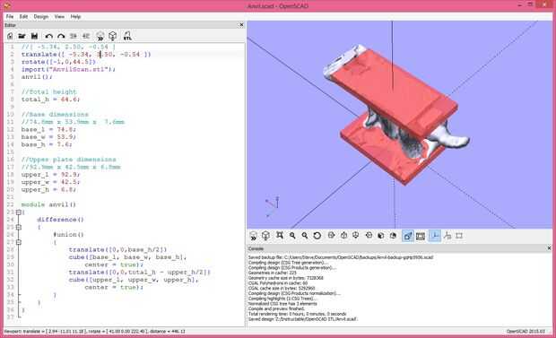Tengo la traducción de STL cerca y ver que tengo que hacer ajustes que no sean de traducción. Uno puede ver que cuando se alinea la base, la parte superior está descentrado. Indica que necesitamos cierta rotación alrededor del eje de X y Y. De hecho, probablemente necesitaremos retocar todas las rotaciones y todas las traducciones. Y permítanme señalar que OpenSCAD no las rotaciones en el orden X, Y y Z. Cuando uno modifica la rotación X, y la acción de Y y rotaciones Z va a cambiar ya que los ejes eran movidos por la rotación de X. Para cambiar el orden, uno podría añadir transformaciones de rotación independiente en el orden deseado. Y uno podría poner también una gira para pasar después (antes en el código) al traducir. No importa cómo uno consigue allí, acaba de obtener el STL alineada con el orden necesario y las combinaciones de transforma.