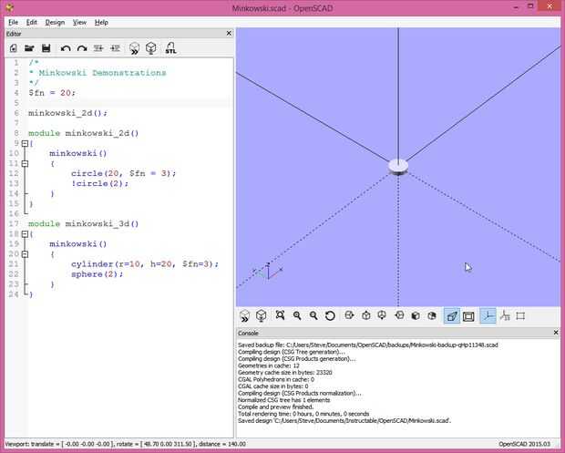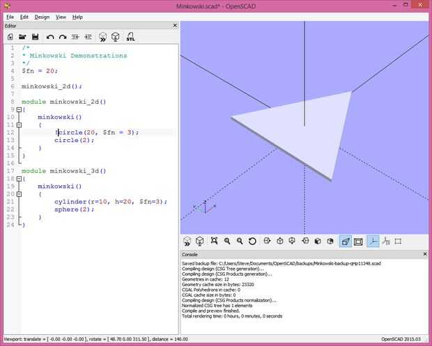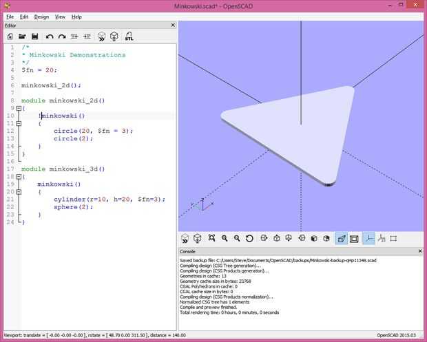 El Minkowski es una combinación inusual. También se llama la suma de Minkowski. He creado un archivo OpenSCAD para demostrarlo. Descárgalo y podemos analizarlo juntos.