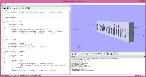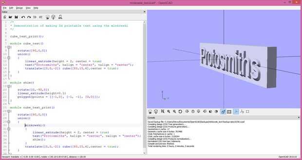 Por ejemplo, para que objetos a ser 3D impreso, haré un Minkowski para crear pendientes de 45 grados en el texto que será sobre una superficie vertical. La cuña que se agrega tiene su punto en la posición 0,0. Todo se agrega en las direcciones -y y - z para el texto horizontal. La superficie del texto no cambia. Hay una pendiente de 45 grados añadida al fondo del todo. El texto es más alto, pero en la dirección hacia abajo, la parte que está incrustada en la superficie.