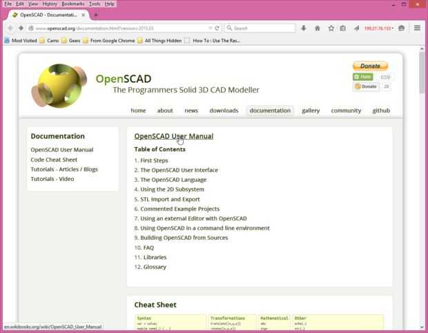 Haga clic en el enlace de Manual de usuario OpenSCAD como se muestra arriba.