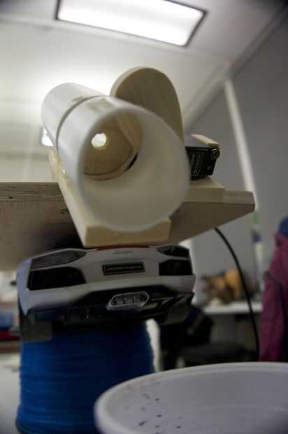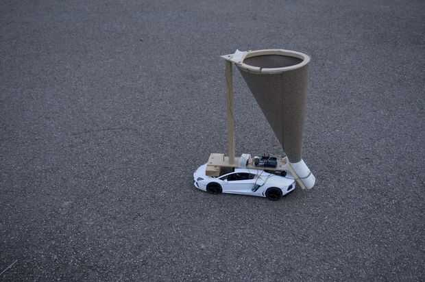 Para la puerta, usé un tubo de PVC para dirigir el polvo hacia la cola del coche. Hice una pieza de madera que montado en el eje del motor se estrecha el orificio del tubo. Entonces agregué unos bloques de madera para fijar el motor en su lugar.