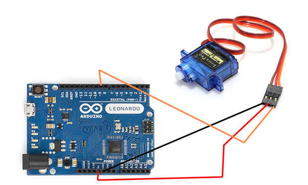 Siga los vínculos en la primera foto. Con jumper de macho a macho cables conectar la tierra del servo (negro o púrpura) a la tierra en el cable de control (amarillo o naranja) al pin 9 en el tablero, la placa Arduino y el cable de alimentación (rojo) al pin de 5v.