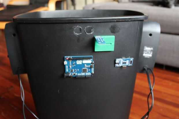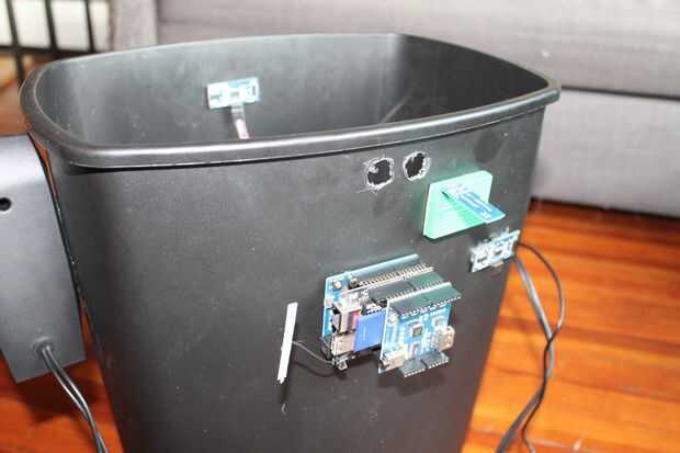 Localizar el sensor de la gama ultrasónica con una pluma en el bote de basura y perfore dos agujeros para ajustar el sensor.