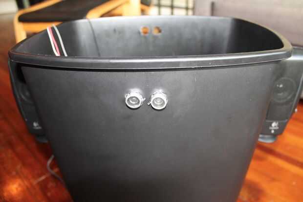 Usar una pistola de pegamento caliente, pegar los altavoces de la computadora al lado de la lata.