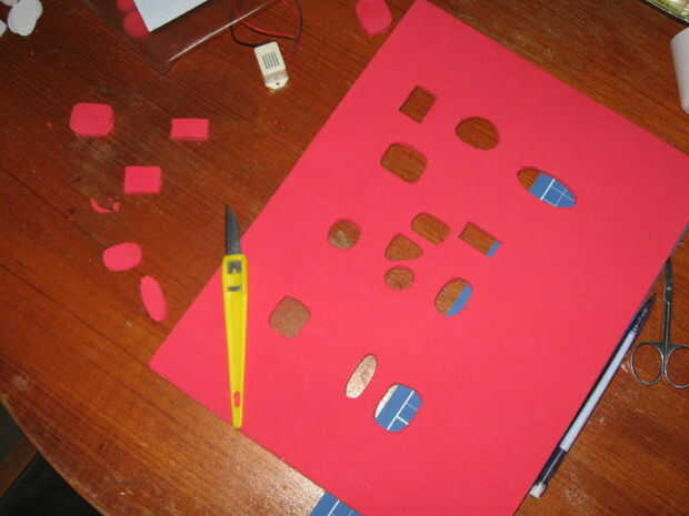 De todos modos, sin duda es una buena manera de ir sobre este siguiente paso. Colocar el cuadro encima de nuestro three-foam-sheets-glued-into-one. Las hojas de espuma debe ser más grande que el cuadro A4, así que trate de obtener la imagen tan central como sea posible. A continuación, agarrar el lápiz retráctil y dibujar directamente sobre el divertido de la espuma, siguiendo el borde del agujero que sólo ha cortado para el zumbador. Mover la imagen de en medio y cortar el agujero.