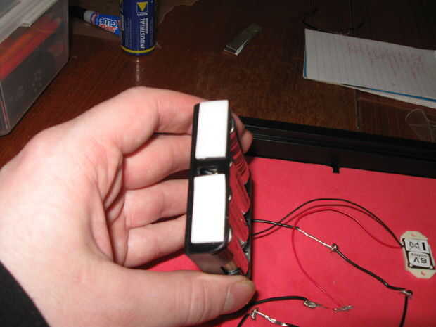 Ahora puede conectar la caja de batería. Usé un par de almohadillas adhesivas para fijar la caja al chasis, pero si lo prefiere puede utilizar tu pistola de pegamento caliente. Asegúrese de pegar la caja de la batería del marco en lugar de la parte posterior de la Junta, no queremos arriesgar el peso de la caja de batería dañar la espuma.