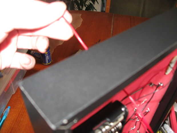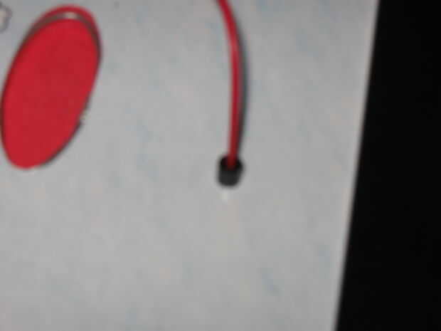 Vuelta el tablero encima. Personalmente, encontré sólo tiene el equipo rojo asomando de la ilustración parecía desordenada. Agarré un solo grano negro de Hama (que creo que se llaman Perler cuentas en los Estados Unidos) y rosca en el cable. Una pequeña gota de pegamento se utiliza para pegar el grano a la imagen, para que todo vea un poco mejor. Si no tienes ninguna cuentas Perler/Hama a mano estoy seguro que puede pensar una alternativa - una lavadora o una nuez pequeña, tal vez.