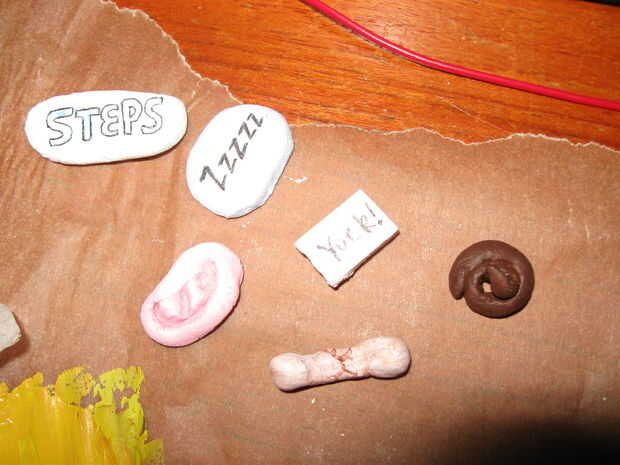 Las formas de "blob" fueron creadas simplemente rodando una bola de plastilina y luego la aplastada en forma. La oreja fue creada usando el mismo proceso y luego usar el mango de mi bisturí para moldear las crestas. La caca se hizo un largo trozo de arcilla y luego enrollado alrededor. El hueso comenzado como un "embutido" de la arcilla - que luego rodé los extremos ligeramente para crear protuberancias y crestas modeladas en ellos con mi bisturí. La fábrica comenzó como una forma cuadrada; Había modelado de datos utilizando la hoja de bisturí y recortar los bordes cuando se seca.