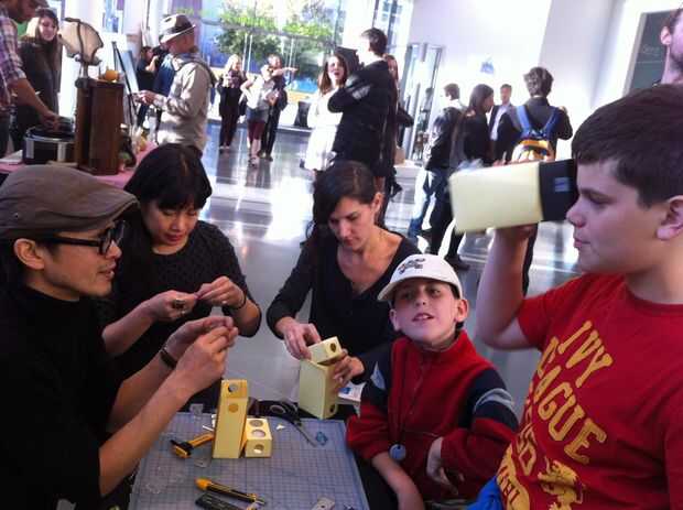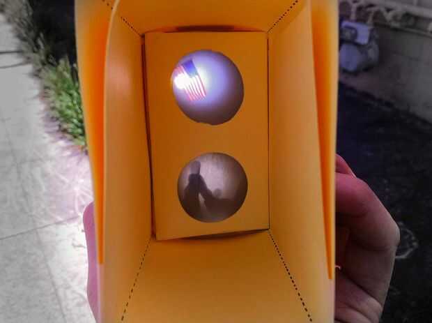 Cómo funciona: Las imágenes captadas por las dos lentes de aumento (una hacia arriba y la otra hacia abajo) son reflejadas por dos espejos de 45 grados y proyecta sobre la lámina de plástico translúcida. Funciona como el visor de una réflex de doble lente. Debido al foco suave de la proyección posterior, la imagen tiene calidad de ensueño.