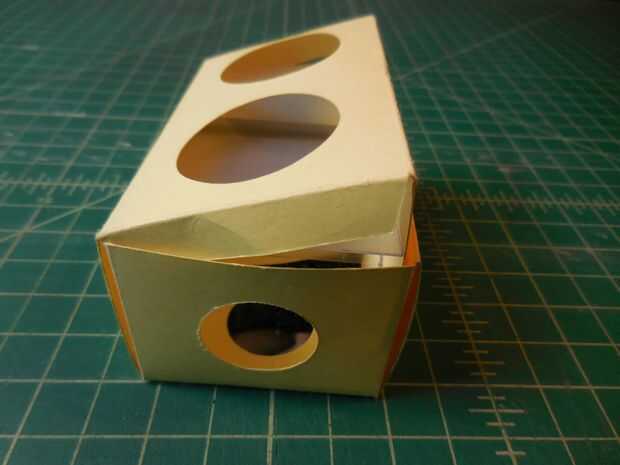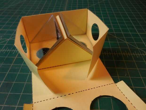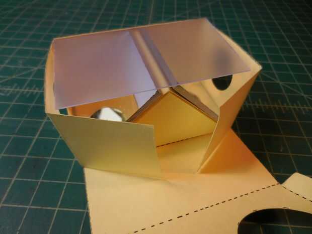 Doblar en una caja y colocar la cuña de espejo dentro de la caja. Poner dos espejos en la cuña. Coloque la lámina de plástico sobre los espejos. Plegar la tapa y cerrar el cuadro. La caja debe tener todas las piezas sin pegamento o cinta.