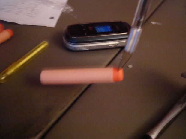 Comience con el agujerito al lado de la punta del dardo. Obtener la herramienta de corte en el agujero, luego corta la punta al otro lado. Consulte el otro pic para el paso final.