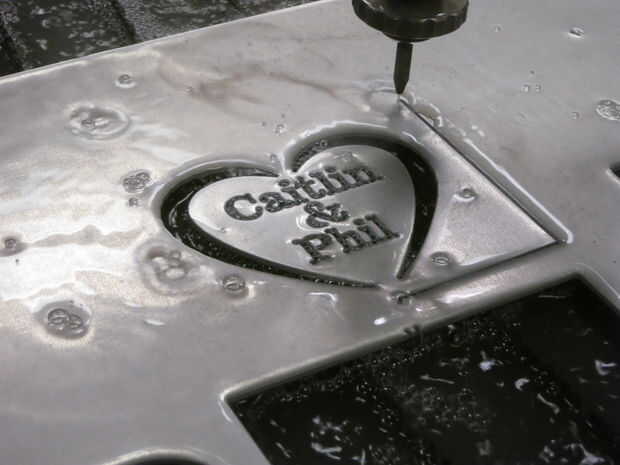 Cuando tomé el curso FlowJet, utilicé un gráfico de prueba que también había utilizado en otros cursos que había tomado, en este caso un gráfico en forma de corazón con mi novia y mi nombre en él. Al tomar el curso por chorro de agua, estaba perturbado cuando este pequeño gráfico tomó 14 minutos y 36 segundos para cortar a través de aluminio espesor de 0,18. Si había elegido hacer este pequeño gráfico fuera de curso, el tiempo de corte de esta pieza habría me costo $43,80! No sólo era este caro, pero la calidad de la salida no fue muy buena; la inscripción en la fuente fue gravemente distorsionada, y la suave curva de la forma del corazón se había convertida en angulares rectas.