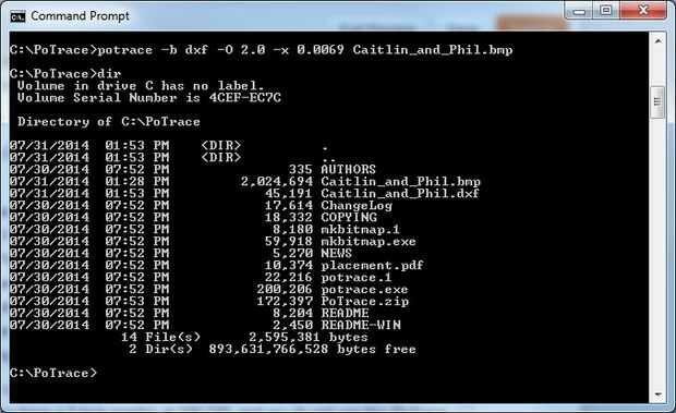 El comando para usar PoTrace también se muestra en la imagen adjunta con un valor de - O más grande. El comando "dir" muestra en el gráfico enumera los archivos en el directorio actual. Este directorio listado para PoTrace muestra el archivo ejecutable "potrace.exe", el archivo de entrada "Caitlin_and_Phil.bmp" y el archivo de salida "Caitlin_and_Phil.dxf". Es este archivo de salida DXF que se abrirá en FlowPath en pasos.