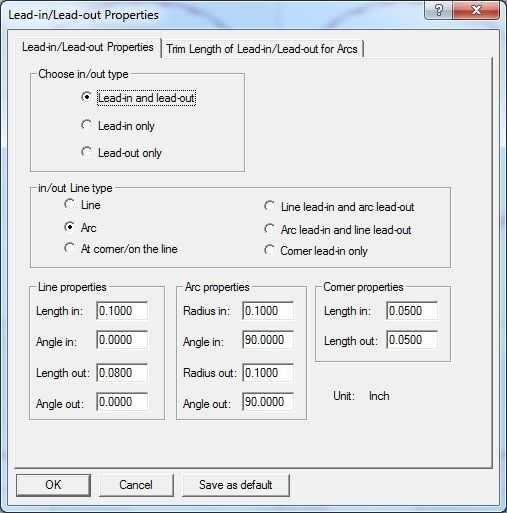 - Establecer su entrada / guías. Una entrada de arco / conducción funciona bien para la mayoría de los casos, no dejar rebabas que tendrá que ser apagado más adelante. Tenga en cuenta que la escala del arco por defecto puede ser demasiado grande para algunos gráficos, para mi gráfica, necesitaba reducir el radio de entrada y guías de 0,100 pulgadas a pulgadas 0,0500, la mitad de su valor predeterminado.