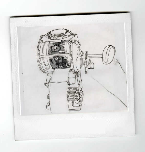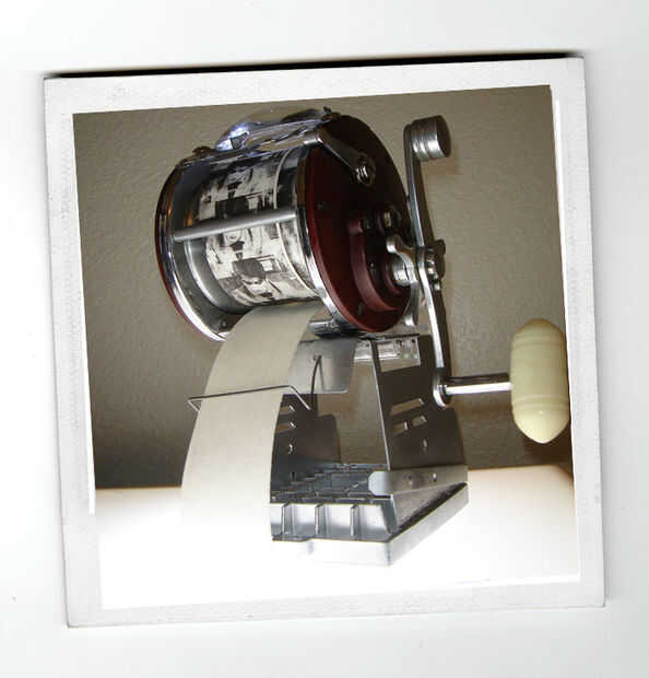 Rotor Opto-escópico - un híbrido de un proyector de diapositivas vintage [serie de Argus modelo III] y un carrete de pesca Penn Peer 309. Este dispositivo híbrido, por ejemplo, le permitirá ver una imagen [como abajo, en un rollo de papel] de forma narrativa a través de la rotación, mientras que el sujeto simultáneamente será ampliado y enmarcado.