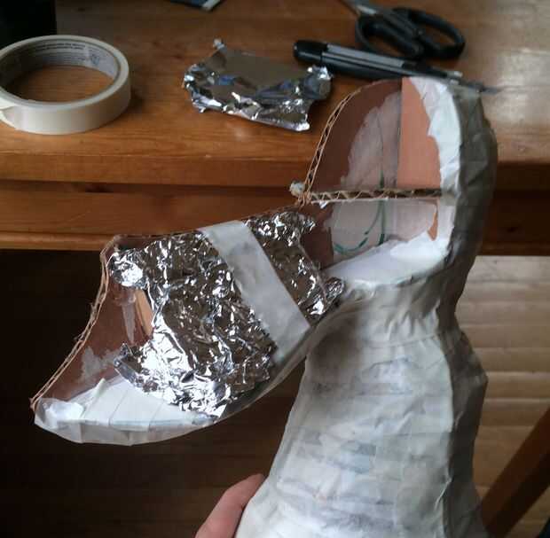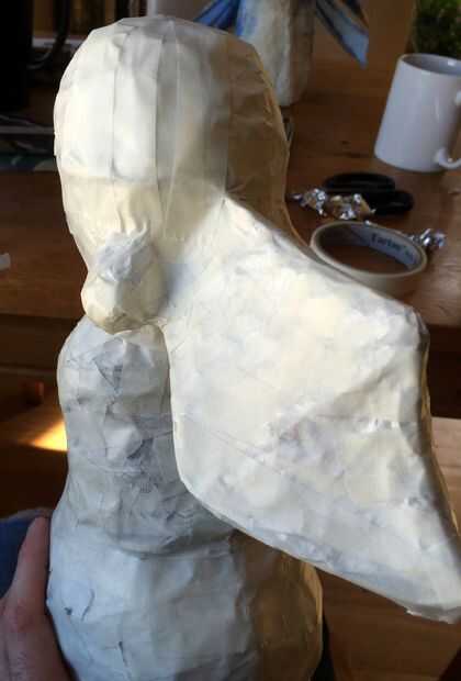 Cuando se llena el cuerpo, el abrigo de los huecos con cinta de enmascarar. Hacer unas Carrilleras con bolas de papel de aluminio y cinta adhesiva en.