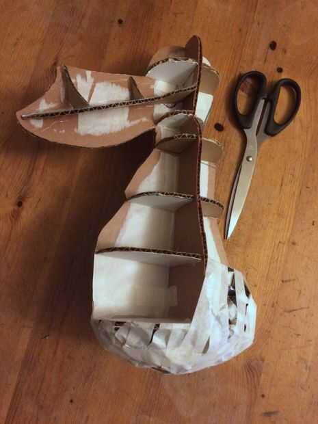 La estructura ahora será muy rígida. Llene los segmentos con periódico arrugado uno por uno y cubierta con cinta de enmascarar. Que desea como aspecto redondo como sea posible, así que el paquete en suficiente papel que no destacan los cantos de cartón debajo de la cinta. Para áreas difíciles, como el honker, usé papel de aluminio porque tiene forma más periódico.