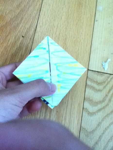 tomar la derecha hacia la esquina y doblar para arriba haciendo una media de papel una forma del triángulo. A continuación, para que hasta la otra esquina y usted vería a medio lados de triángulos haciendo un diamante. Hacer que la otra parte.