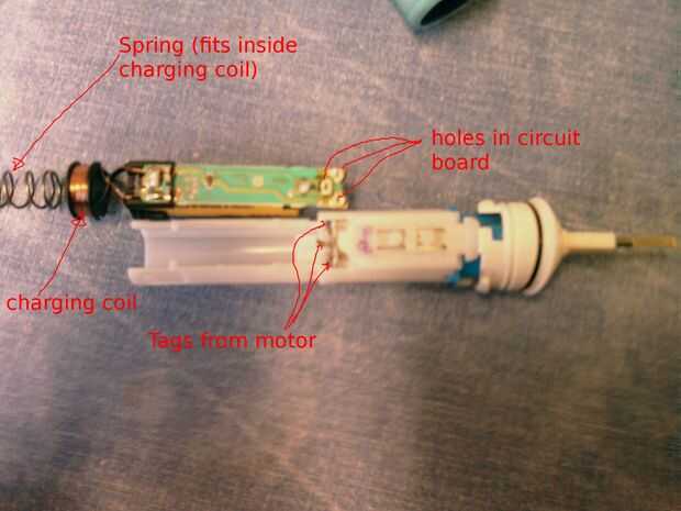 Una vez han aflojado puede extraer la parte superior del mecanismo de cepillo de la caja. A continuación puedes ver la batería, que se une a una placa de circuito. Las tres lengüetas de metal que conectan el motor y cambiar a la placa de circuito tienen el ser un soldado para quitar el tablero y la batería de la carcasa interior plástico blanco. Esto puede hacerse con una soldadura retirar herramienta o trenza de desoldar.