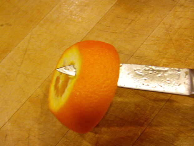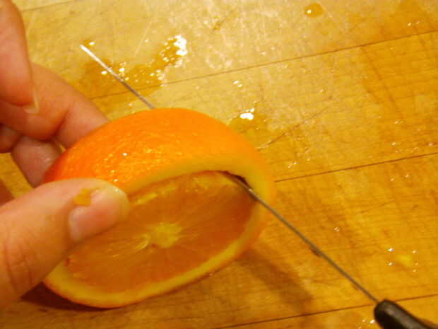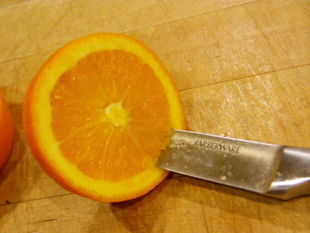 Para ello, meter el cuchillo en la naranja. Usted debe ser capaz de sentir que el cuchillo corta más fácil en la parte de carne. Su angulado, pero el naranja le dirá dónde cortar. Seguir este camino de menor resistencia todo el camino alrededor de la naranja.