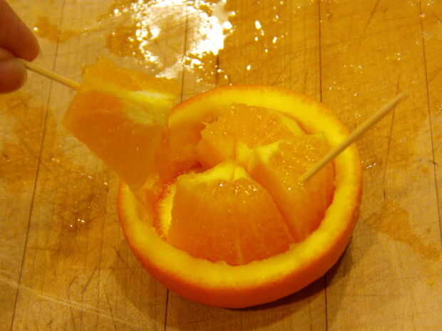 Con la base más grande en la parte inferior, coloque la carne de la naranja en el recipiente. Añadir palillos de dientes en algunos o todos los segmentos.