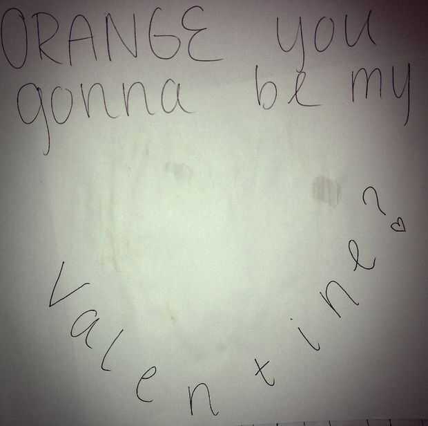 Con cualquier utinsel de escritura ¿como, escriba "naranja vas a ser mi San Valentín?" en la hoja de papel o superficie plana está utilizando. Asegúrese de dejar suficiente espacio para el corazón de clementine que está a punto de poner en él.